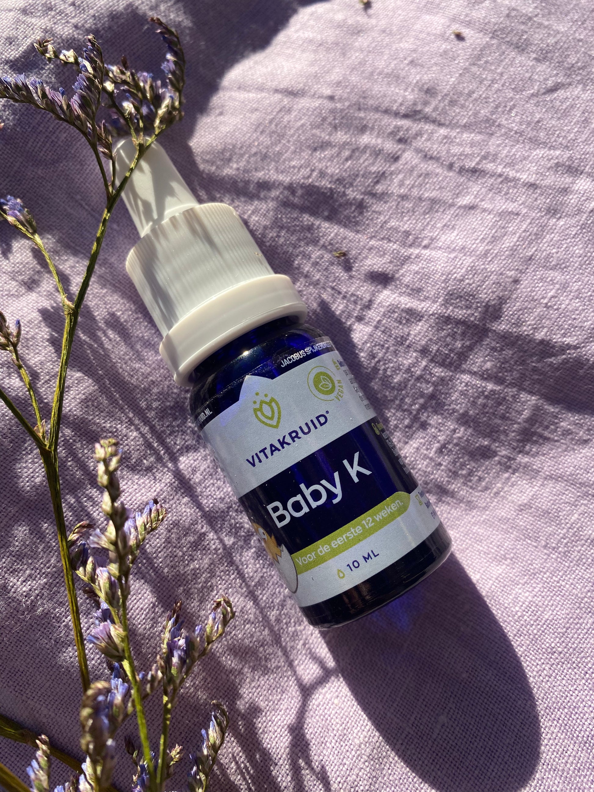 Baby's hebben de eerste drie maanden nog niet de juiste darmbacteriën om vitamine K zelf aan te maken. Daarom geeft je verloskundige na de geboorte een eerste dosering (1.000 mcg) vitamine K die goed is voor de eerste week. Na die eerste week adviseren wij je om de eerste vier maanden elke dag 150 mcg vitamine K te geven. Dit flesje bevat 10 ml, precies genoeg voor de eerste vier maanden.