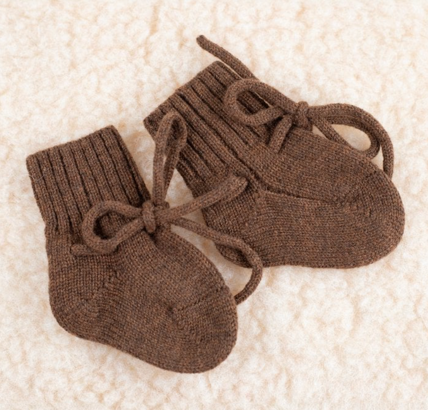 Handgemaakte newborn sokjes in de kleur Brunette. De sokjes zijn gemaakt van 100% merinowol en zijn voor voetjes tot 9,5 cm (0-6 maanden).